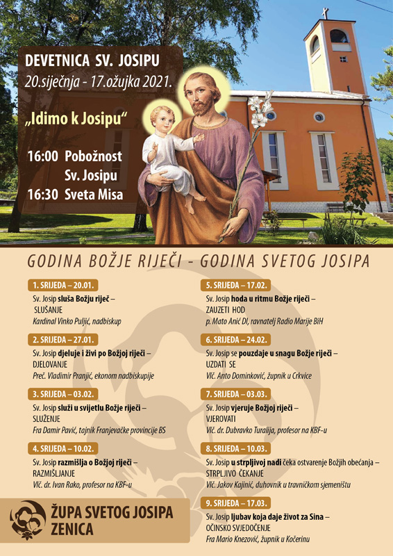 Poboznost 30 Dana Na Cast Sv Josipa Audio Vjera Ufanje Ljubav from vjeraufanjeljubav.com.hr Josipe, prijatelju i zaštitniče sviju, čuvaru isusa i sviju koji zazivaju tvoju pomoć, velik si jer od boga zadobiješ sve za što te ljudi mole. U župi djeluje samo jedan svećenik, ukida se radno vrijeme iza večernje mise. Josipe, glavaru svete nazaretske obitelji i čuvaru crkve božje, tebi se kroz stoljeća crkva u hrvata utjecala kao dvorana nasuprot svetišta biblijska grupa: