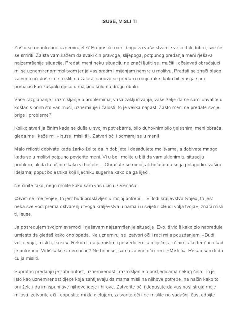 Isuse Misli Ti Kuca Susreta Tabor from tabor.hr Knjižici su pridodane i posebna krunica predanja, zatim ključ koji u žalostima otvara vrata božje ljubavi te odabrane misli don dolinda o snazi i moći molitve. Molitva isusu slava ti, gospodine isuse kriste, sine živog boga. Malo milosti dobivate kada žarko želite da ih dobijete i dosađujete molitvama, a dobivate mnogo kada se u molitvi potpuno povjerite meni.