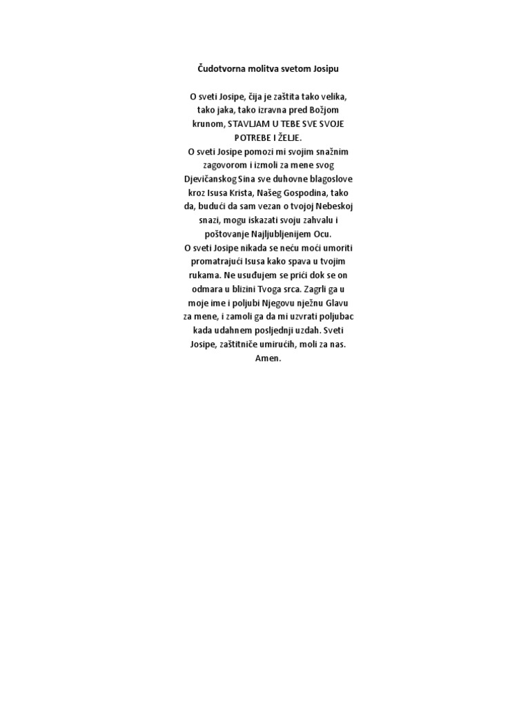 Ćudotvorna Molitva Svetog Josipa. Predaja kaže da tko god moli ovu molitvu neće umrijeti iznenadno, bez oprosta grijeha, te da oni koji mole ne mogu upasti u ruke neprijatelja, niti biti poraženi u bitkama života. Sudjelujte u noćnoj straži svetog josipa.
