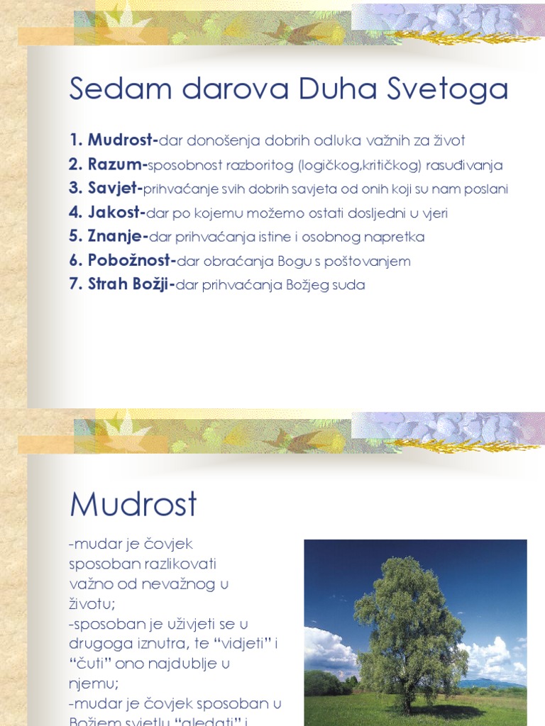 Mudrost razum savjet jakost znanje pobožnost i strah Božji. Možda su kršćani premalo svjesni tih i sličnih darova na koje imaju pravo po sakramentu Duha. Verzija u Wordu dostupna OVDJE.
