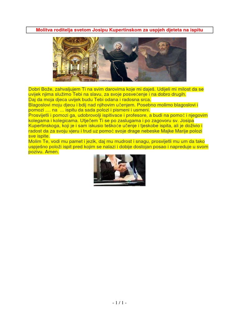 Molitva Roditelja Sv Josipu Kupertinskon Za Uspjeh Djeteta Na Ispitu Pdf