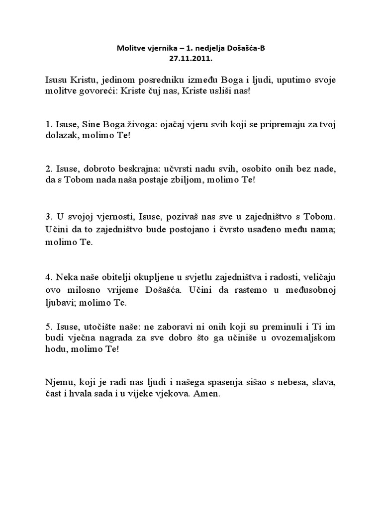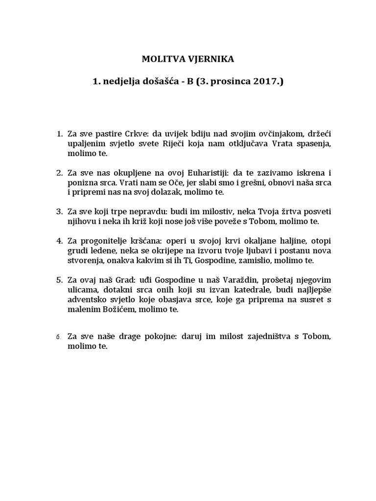 Molitva Vjernika 4 Nedjelja DošašćaZaista zaista kažem vam tko god u ovčinjak ne ulazi na vrata nego negdje drugdje preskače kradljivac je i nalazite se ovdje. Zahvalna se srca spominjemo Gospodnjih divnih djela koja je učinio hiteći da nas spasi. Da se blagovijest o rođenju tvoga sina Isusa Krista može slobodno naviještati u cijelome svijetu molimo te za mir i pomirenje među narodima i.