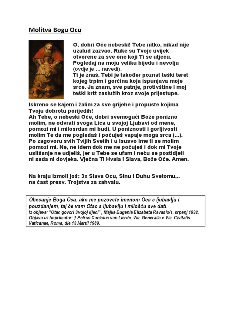 Molitva ocu i duhu svetom. Sve molitve trebaju biti usmjerene našem trojedinom Bogu Ocu Sinu i Svetom Duhu. Oče moj Oče dobri Tebi se prikazujem Tebi se predajem. Obećanja Duha Svetoga Ove će se litanije proširiti kao lavina.